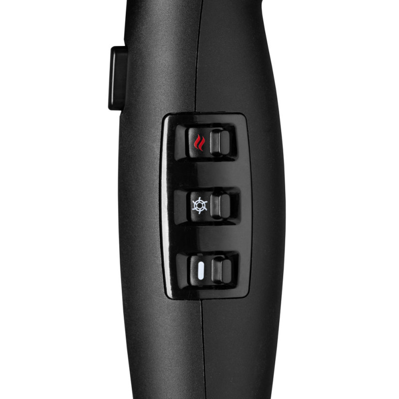 Фен для волос BAB7600E оснащен механическим кнопочным управлением с применением минимума электроники, что в определенной степени повышает надежность данной модели – чем проще, тем вернее. К выбору пользователя есть 2 скоростных режима работы фена (78 000 и 95 600 rpm) и 2 режима нагрева (78 °C и 115 °C). Функция холодного воздуха работает по нажатию отдельной кнопки, расположенной по центру ручки. Для получения холодного воздуха кнопку не нужно постоянно удерживать: одно нажатие кнопки включает холодный обдув, повторное нажатие – выключает. Большой гибкостью настройки фен не обладает, но данных режимов вполне достаточно для сушки практически любых волос и комфортной работы в целом.