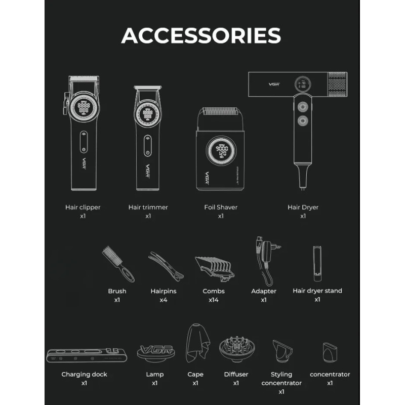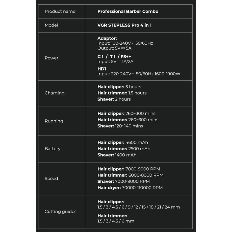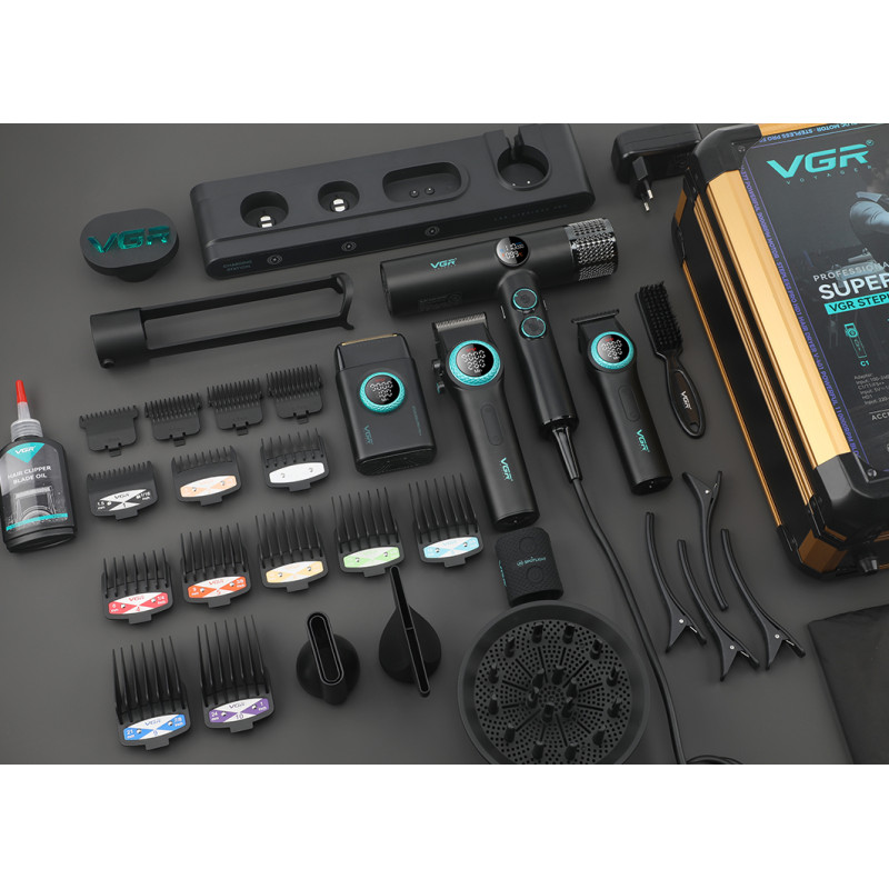 Набор инструмента VGR Stepless 4 in 1 Red - это отличный подарок профессиональному стилисту или барберу, а так же он может стать отличным подарком всей семье. Потрясающий набор, который состоит из четырех популярнейших и функциональных моделей - фена для волос, машинки для стрижки, триммера и шейвера. Такое решение не оставит равнодушным никого, а богатая комплектация придает особой пикантности, рассматривая его, как возможный вариант для себя. Все модели из набора есть в нашем каталоге, коротко пройдемся по каждой из них. При необходимости нажимайте на ссылку и полностью ознакамливайтесь с конкретной моделью из набора.