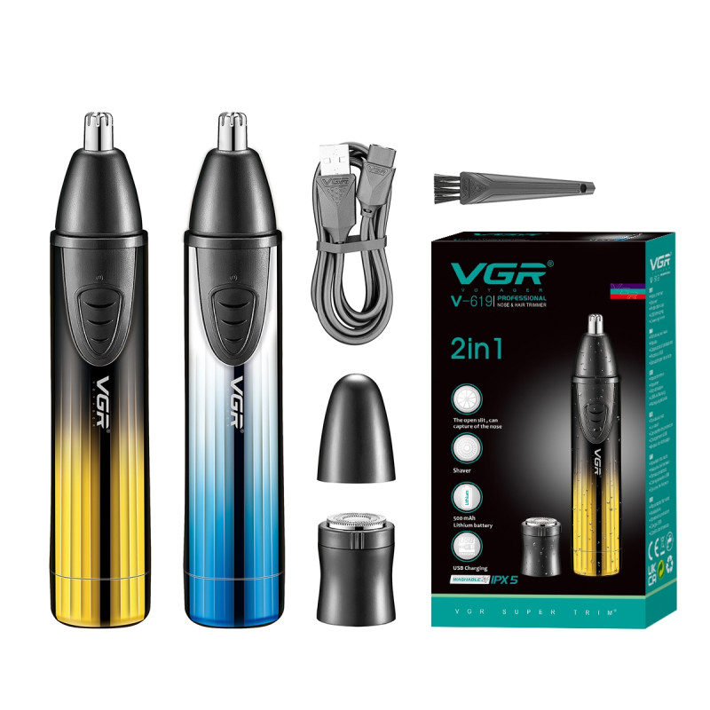 VGR V-619 – отличный беспроводной триммер для носа 2в1. Компактная модель с хорошими возможностями и отличной комплектацией, которая включает в себя насадку для удаления волос в носу и ушах, а так же насадку для бритья. Такой аксессуар никогда не будет лишним как дома, так и в различных путешествиях или командировках.