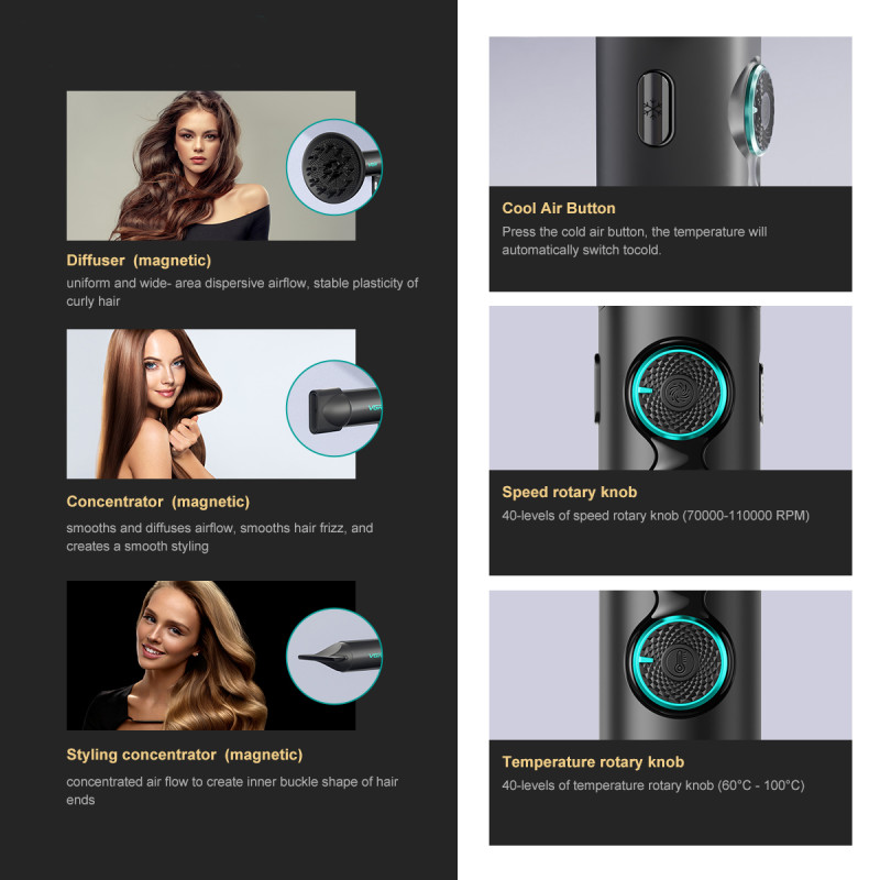 Фен V-401 оснащений мотором-турбіною нового покоління - це безщітковий мотор з цифровим управлінням, який працює на максимальній частоті 110 000 оборотів на хвилину, що уможливлює отримання повітряного потоку на дуже великій швидкості. При цьому рівень шуму складає всього 80 дБ. Потужний потік у поєднанні з тепловою потужністю 1900 Вт робить сушіння волосся швидким і безпечним. Магазин ploika.com.ua нагадує, що невелика потужність і висока швидкість повітря забезпечать сушіння волосся швидше та безпечніше, ніж потужніша модель зі стандартним мотором.