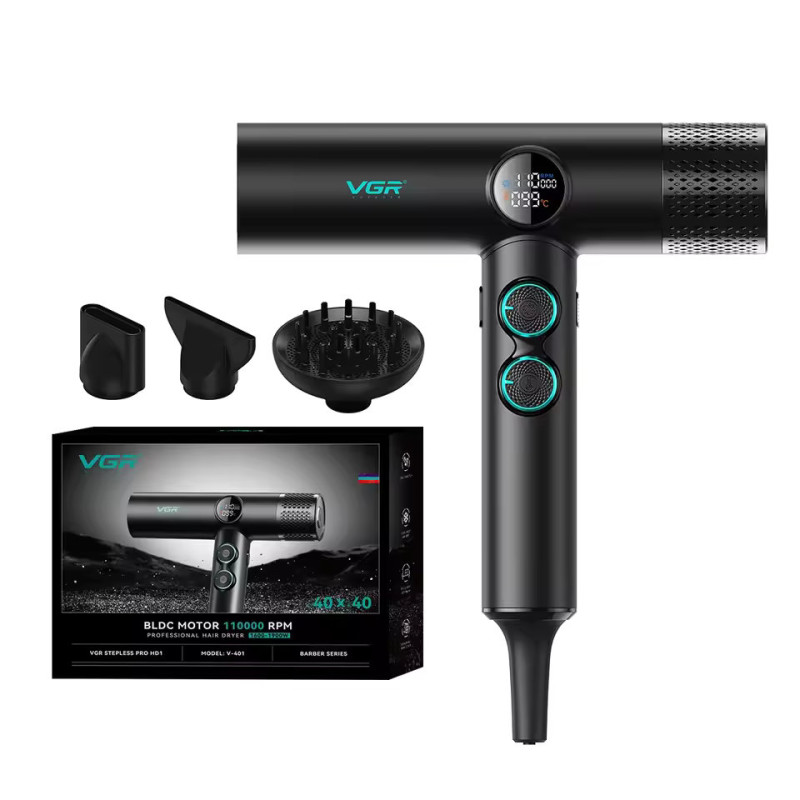 VGR V-401 - це сучасний багатофункціональний професійний фен для волосся нового покоління, в якому використовується новий тип мотора турбінного типу, що дозволяє зробити фен максимально компактним, легким і ефективним. Завдяки сучасним технологіям сушіння волосся стало максимально безпечним та швидким.