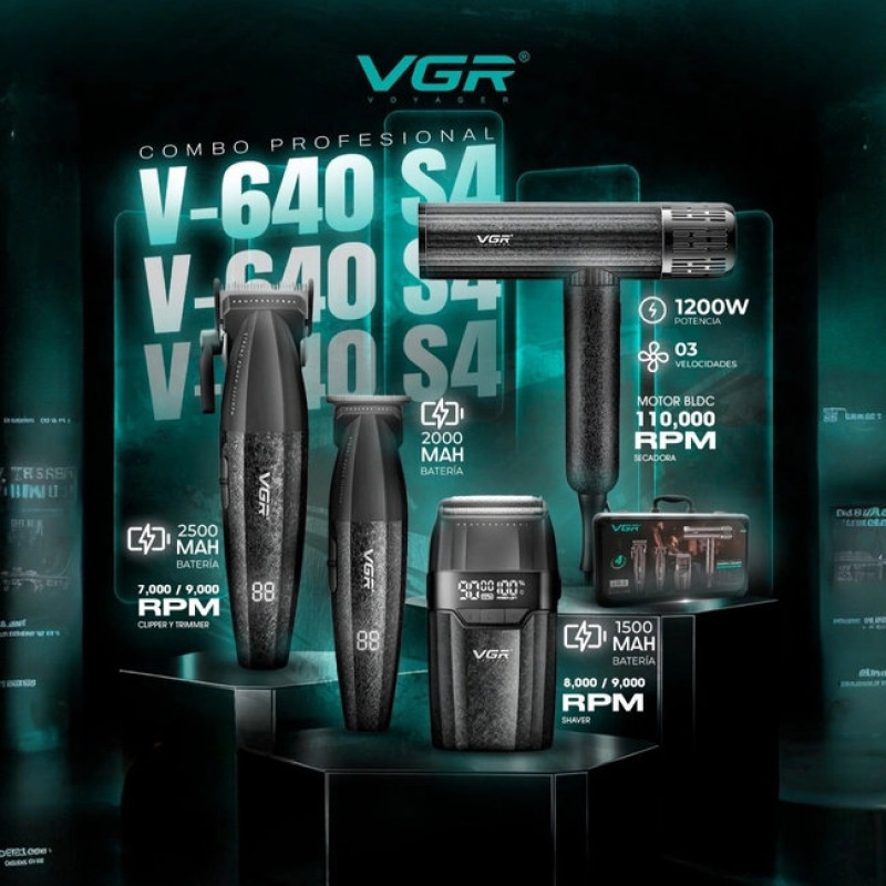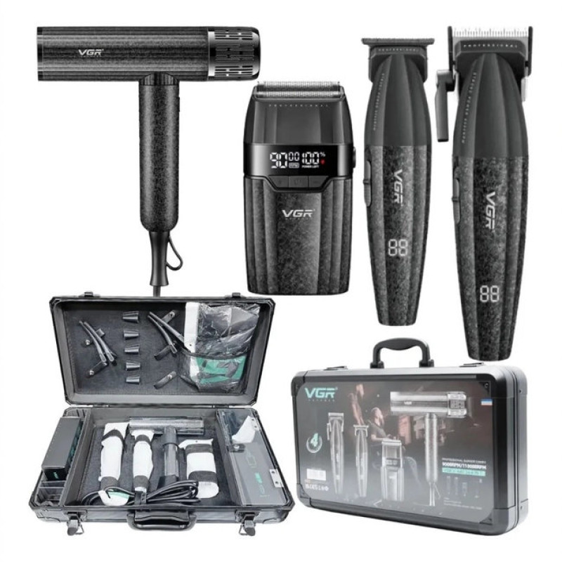 VGR V-640S4 Black - є максимально функціональним професійним набором машинок, який складається з популярних моделей: фена V-640HD, машинки V-003, шейвера V-906 і тримера V-308. Ультрасучасні та функціональні машинки однозначно зроблять вашу роботу максимально комфортною, приємною та результативною, адже вони оснащені всіма необхідними сучасними функціями та технологіями для комфортної якісної стрижки.